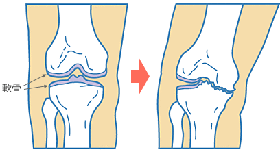 膝の痛みの原因の代表である変形性膝関節症は、膝の軟骨が経年変化によってすりへる病気です。はじめは正座が困難になるなど、痛みで膝が曲がりにくくなりますが、やがて膝に水がたまる、痛みで足をひきずるなどの症状に発展します。